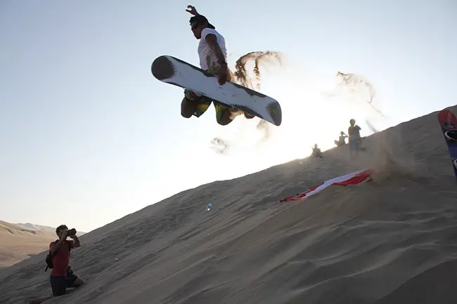 There is another adventure sport that delights tourists on the sand dunes that surround Huacachina oasis sanctuary. Standing on a small piece of the board that can moved on the sand and slipping down through sand dunes while maintaining the body’s balance. That sport is famous as sandboarding. Generally, Desert land is not a flat terrain. It has steep slopes in some places, and the slopes end in a sand dune that rises again. However, it is not easy to slip down with this board and balance the bodyweight on these sand dunes and slopes. The talented people who are skilled in this sport enjoy it a lot by engaging in that adventure sport. Untrained people who cannot stand by their feet on the sandboard while slipping down can lie down and slide on the board.
