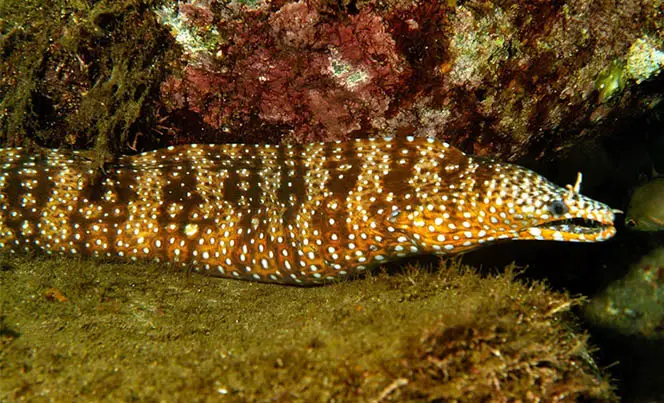 The Moray eel is mainly a large eel species, which can exclusively found in tropical and temperate marine waters. Some several other species live in brackish water, and a few species can identify in freshwater. However, moray eel has a snake appearance like other eel species, but that doesn’t make them a reptile; actually, they are fishes.